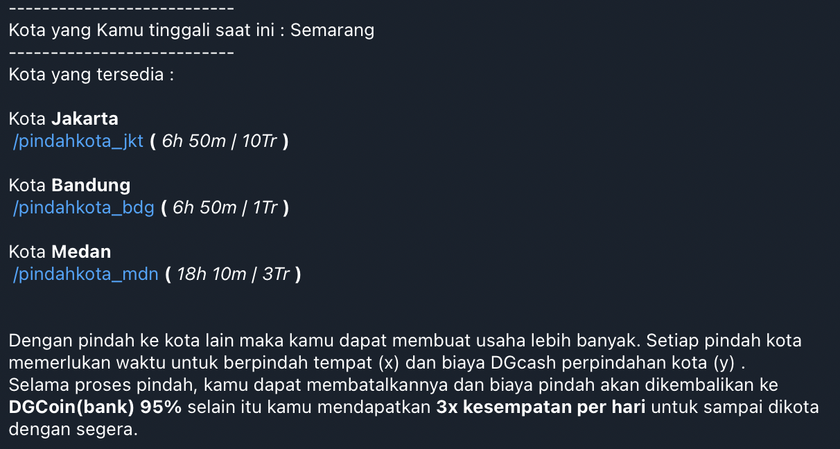Penduduk dapat melakukan pindah kota. Awalnya, kamu akan berada di Jakarta. Dengan adanya pindah kota, maka kamu bisa membangun usaha lainnya. Walau sudah pindah kota, rek bank dan cash masih tetap sama. Setiap pindah kota memerlukann waktu pindah dan biaya pindah. Tiap kota memungkinkan memiliki musibah/bencana yang berbeda. Disetiap kota, kamu bisa membeli blok tanah untuk nantinya akan dibangun atau dijual kembali.