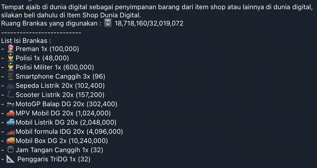 Brankas di DG merupakan benda ajaib yang dapat menyimpan segala item toko DG seperti booster, investasi hingga asset. Di item/asset tertentu dapat memberikan efek pada akun penduduk sperti peningkatan keamanan maupun kecepatan pendapatan di usaha.