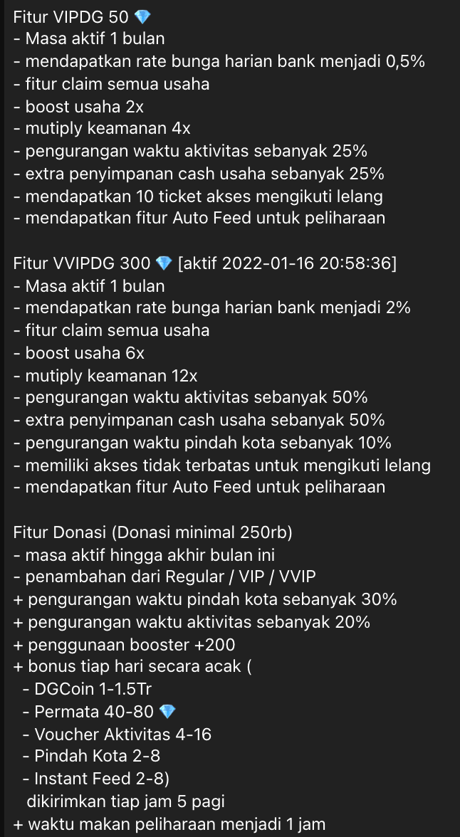 Apakah ada fitur premium di DuDi ini ? Ya tentu ada. Terdapat 3 tipe pemain yaitu Regular, VIP dan VVIP. VIP dan VVIP didapatkan dengan menggunakan permata dengan masa aktif 1 bulan kedepan. Ada tambahan fitur bagi yang melakukan TopUp/Donasi di DG Telegram ini. Bagi yang melakukan donasi akan mendapatkan profile tambahan yaitu Crazy Rich berdasarkan jumlah akumulasi donasi. Setiap level akan mendapatkan mutiply permata sesuai level.