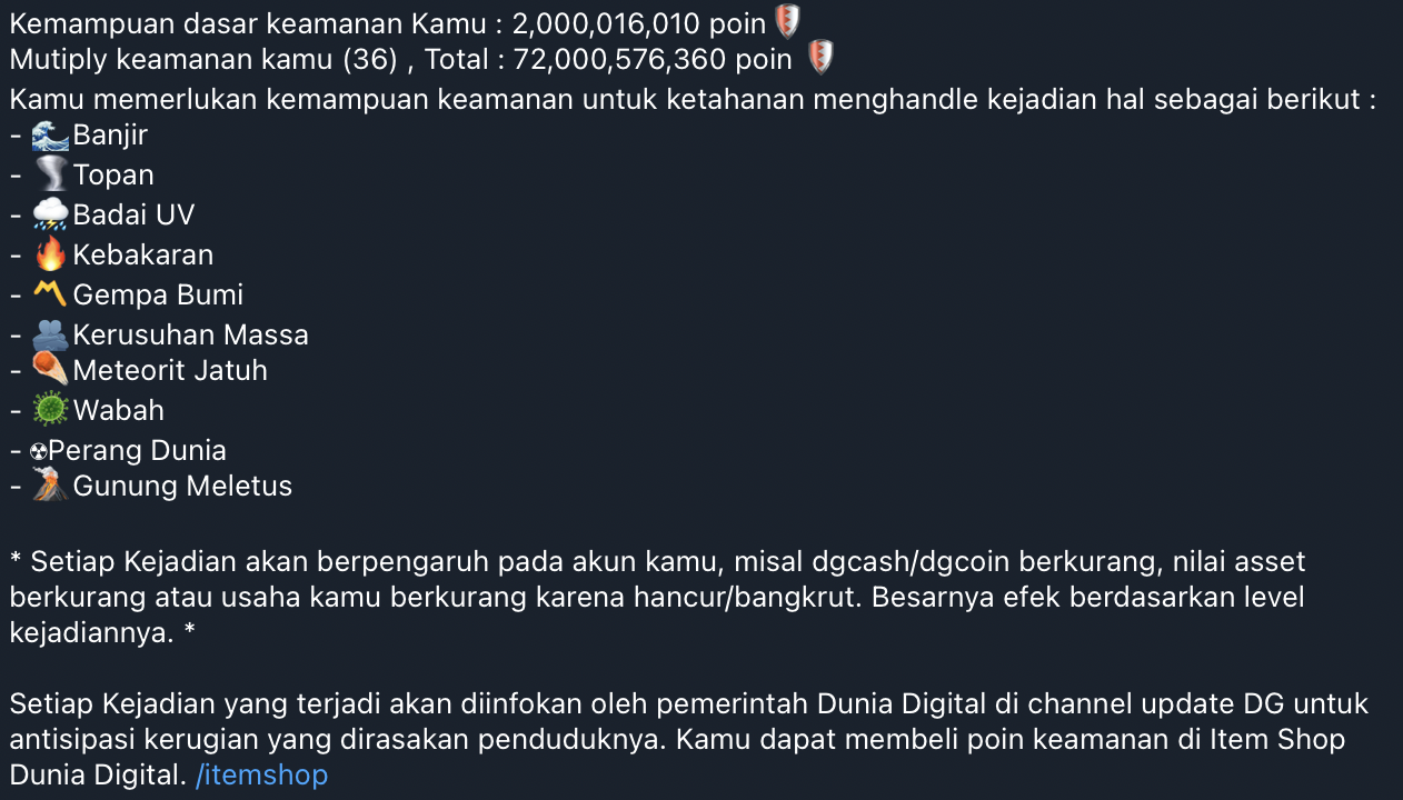 Di DG juga diperlukan poin keamanan, dimana poin ini menjadi nilai proteksi dalam mengurangi efek dari musibah/ancaman yang terjadi di DG. Efek dari ancaman tersebut dapat berupa pengurangan cash, coin, usaha , asset hingga bunga bank. Tiap ancaman/musibah akan memiliki efek yang berbeda beda, maka penduduk DG perlu berhati-hati jika mendapatkan pengumuman dari pemerintahan DG. Untuk musibah memiliki tingkat dimulai dari tingkat 1 hingga 10. Musibah dapat bersifat global atau per kota.