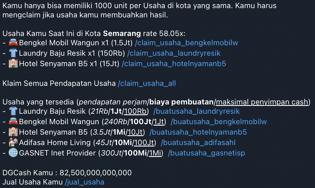 Di DG kamu bisa memiliki usaha untuk mendapatkam DGCash. untuk membelinya , kamu perlu memperhatikan 3 hal yaitu pendapatan, harga beli usaha dan maksimal penyimpanan pendapatan. Usahamu akan memberikan pendapatan per jamnya, jika akumulasinya sampai maksimal penyimpanannya maka tidak akan bertambah lagi.