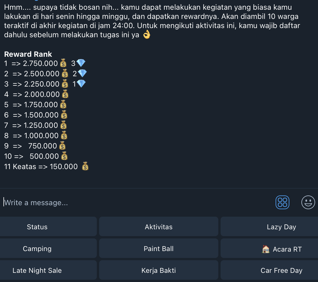 - Terdapat event harian yang dapat dilakukan untuk menambah cash dan permata, seperti Hari Senin (Lazy Day), Selasa (Camping), Rabu (Paint Ball) , Kamis (Acara RT) , Jumat (Late Night Sale) , Sabtu (Kerja Bakti) dan Minggu (Car Free Day) .