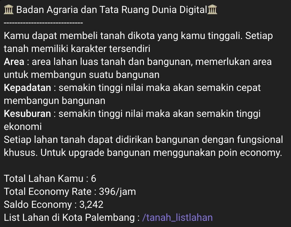 permainan text based by telegram yang mengambil latarbelakang kehidupan riil dijadikan digital dimana manusia bisa bekerja, jalan-jalan, berkebun, membeli tanah hingga assets. Kamu dapat mengaksesnya di https://telegram.me/duniadigitalbot